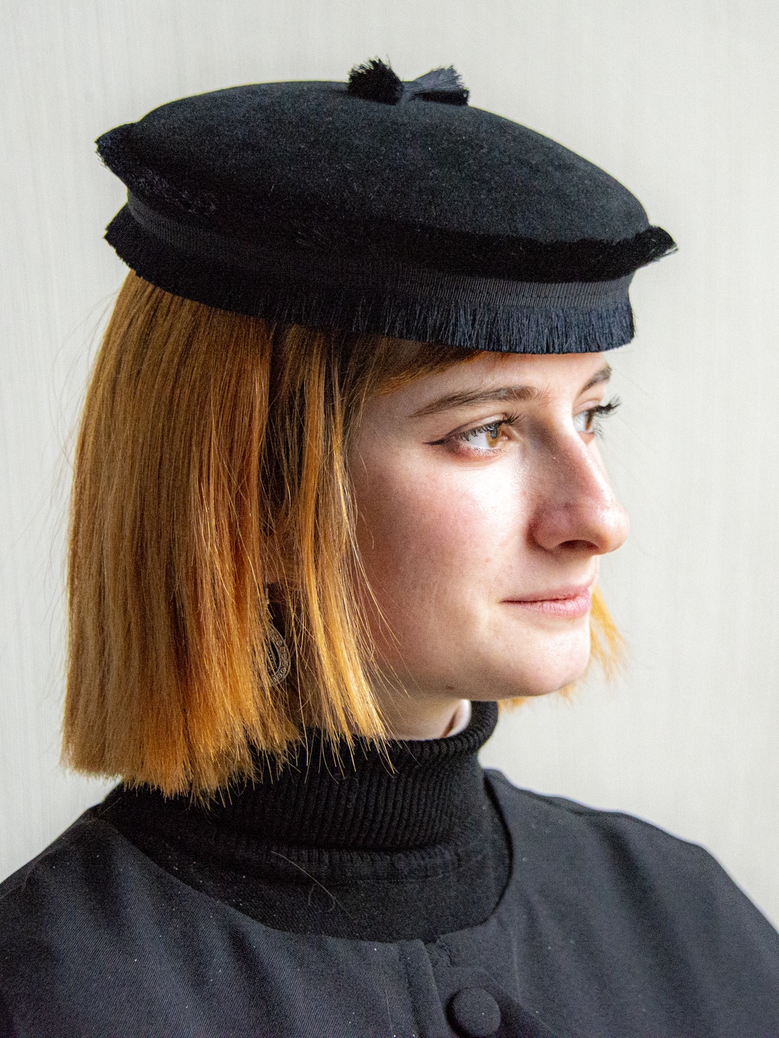 « Toque Médicis frangée », en feutre taupé noir dont les bords sont ornés d’un ruban Julien FAURE à double frange. En son sommet, petit noeud réalisé dans le même ruban. Bouffette (petit nœud indiquant l’arrière du chapeau) verte posée à l’intérieur sur un gros-grain noir. Élastique de maintien.