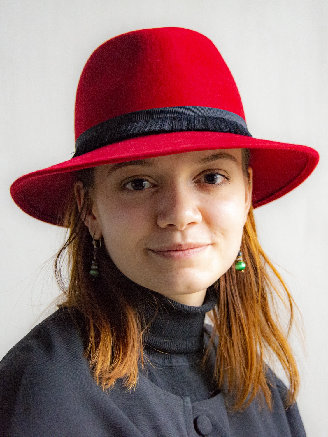 « Stéphanie, Frange courte », en feutre ras rouge vermillon. La calotte mascottée est ceinturée d’un ruban à franges Julien FAURE. Bord replié.