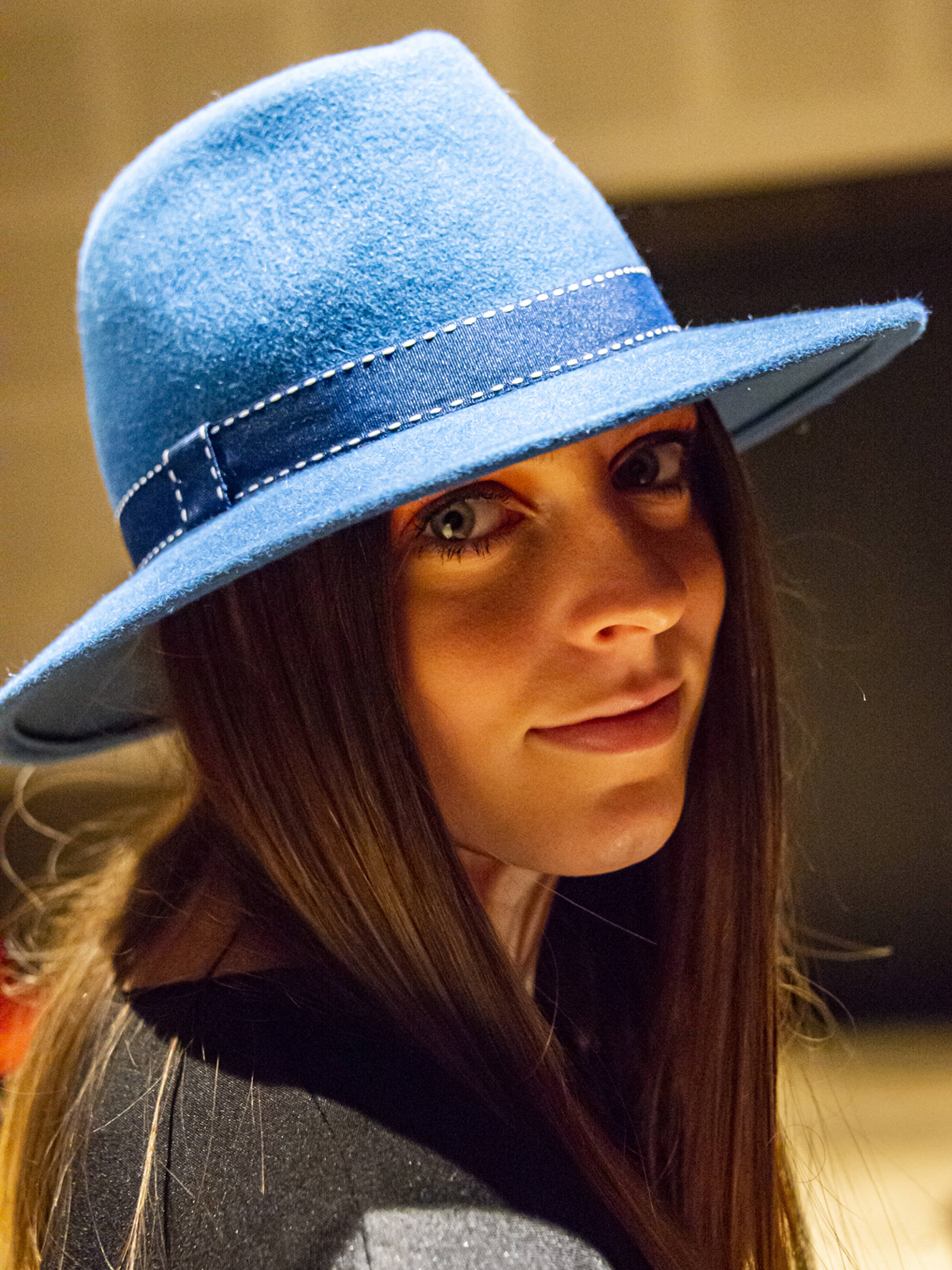 « Dessus-dessous » : chapeau Stéphanie en feutre ras bleu Murano. Calotte mascottée, ceinturée d’un ruban fantaisie Julien FAURE d’un bleu plus soutenu bordé de surpiqûres blanches. Traverse réalisée dans le même ruban. Bord replié à l’intérieur.
